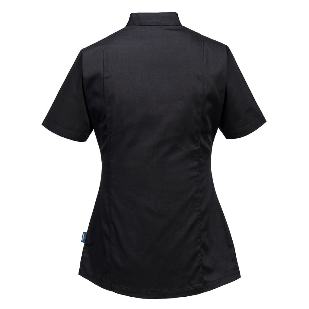 Tartós poliészter/pamut szövet női tunika, amely alapanyaga nem zsugorodik, megőrzi a termék eredeti méretét a mosások után. A kulcs fontosságú részeken innovatív rugalmas panelekkel, Action hátrésszel, oldalsó szellőzőnyílásokkal, mandarin gallérral és egy könnyen hozzáférhető elülső cipzárnyílással rendelkezik. A termék gépben mosható 60°C-on.