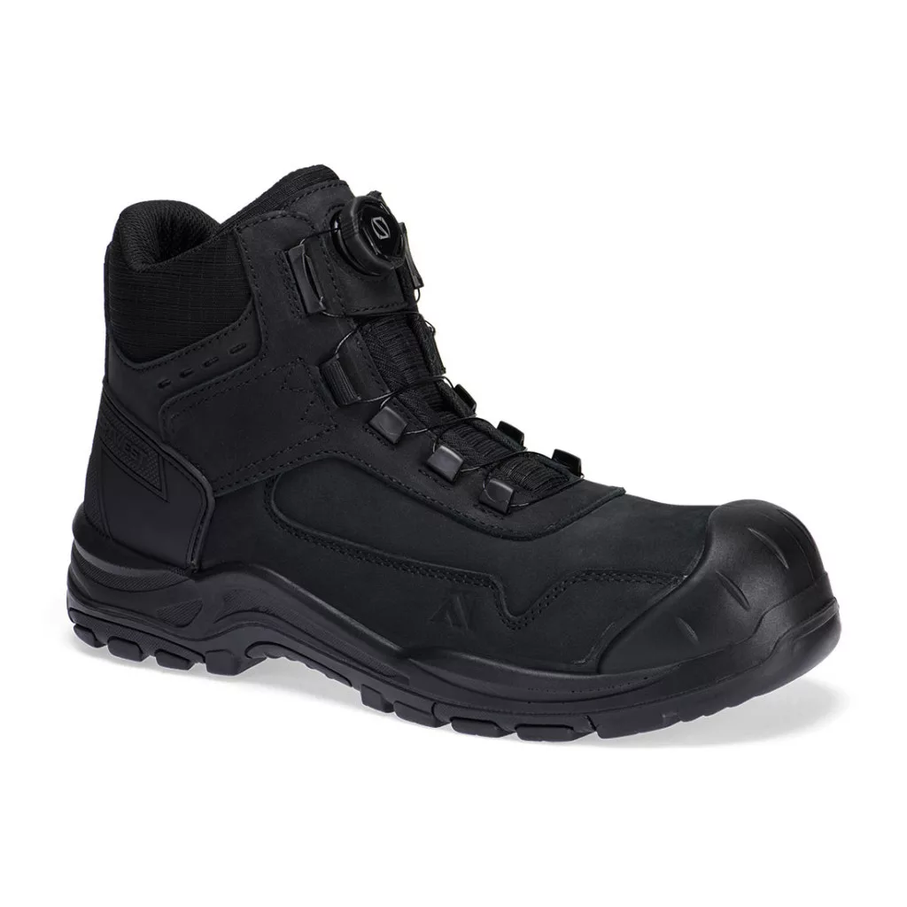 Védő acél lábfejjel, talpátszúrás elleni acél talplemezzel, hőálló külső talppal (300°C), strapabíró orrborítással, energiaelnyelő sarokkal, PU/gumi, csúszásmentes talppal és CE minősítéssel rendelkező antisztatikus munkavédelmi bakancs, amely olaj- és vízálló.